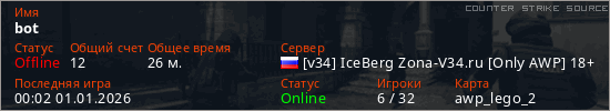 Играет на Counter Strike Source сервере. Страна: РоссияПервый раз замечен 22:45 26.11.2025