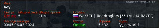 Играет на Counter Strike 1.6 сервере. Страна: РоссияПервый раз замечен 13:11 02.08.2022