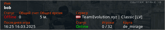 Играет на Counter Strike 1.6 сервере. Страна: ЛатвияПервый раз замечен 16:13 16.03.2025