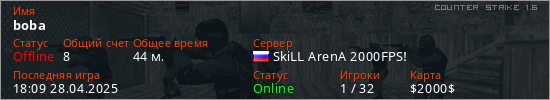 Играет на Counter Strike 1.6 сервере. Страна: РоссияПервый раз замечен 23:39 01.03.2023