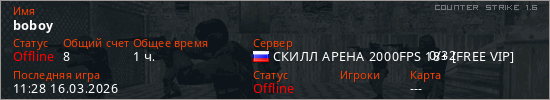 Играет на Counter Strike 1.6 сервере. Страна: РоссияПервый раз замечен 15:02 28.02.2026