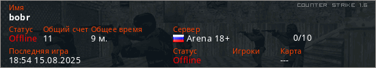 Играет на Counter Strike 1.6 сервере. Страна: РоссияПервый раз замечен 18:19 15.08.2025