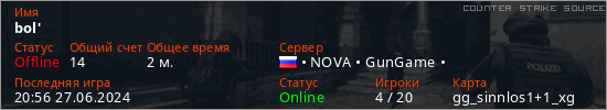 Играет на Counter Strike Source сервере. Страна: РоссияПервый раз замечен 20:56 27.06.2024