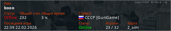 Играет на Counter Strike 1.6 сервере. Страна: РоссияПервый раз замечен 12:55 22.02.2026