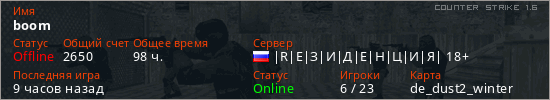 Играет на Counter Strike 1.6 сервере. Страна: РоссияПервый раз замечен 19:15 27.03.2019