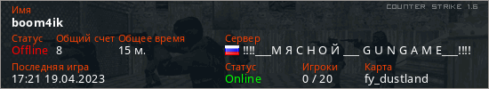 Играет на Counter Strike 1.6 сервере. Страна: РоссияПервый раз замечен 17:15 19.04.2023