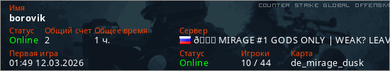 Играет на Counter Strike Global Offensive сервере. Страна: РоссияПервый раз замечен 01:49 12.03.2026