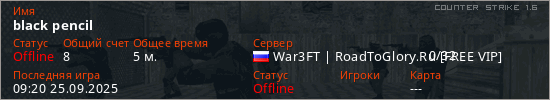 Играет на Counter Strike 1.6 сервере. Страна: РоссияПервый раз замечен 09:06 25.09.2025