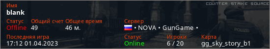 Играет на Counter Strike Source сервере. Страна: РоссияПервый раз замечен 09:36 12.11.2022