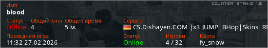 Последний раз был в сети 11:32 27.02.2026 Игрок с таким ником замечен на 27 серверах