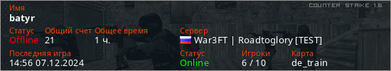 Играет на Counter Strike 1.6 сервере. Страна: РоссияПервый раз замечен 10:05 08.10.2024