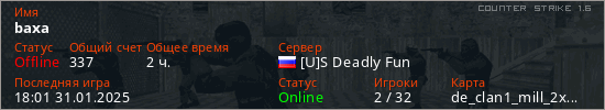 Играет на Counter Strike 1.6 сервере. Страна: РоссияПервый раз замечен 18:29 10.02.2022