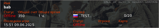 Играет на Call of Duty 4: Modern Warfare сервере. Страна: РоссияПервый раз замечен 21:52 20.04.2025