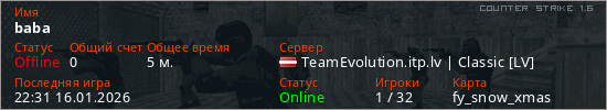 Играет на Counter Strike 1.6 сервере. Страна: ЛатвияПервый раз замечен 22:26 16.01.2026