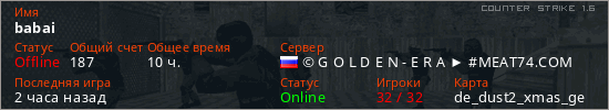 Последний раз был в сети Час назад Игрок с таким ником замечен на 25 серверах