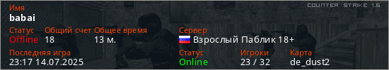 Последний раз был в сети 23:17 14.07.2025 Игрок с таким ником замечен на 25 серверах