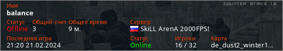 Играет на Counter Strike 1.6 сервере. Страна: РоссияПервый раз замечен 16:46 11.02.2024