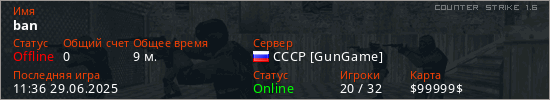 Играет на Counter Strike 1.6 сервере. Страна: РоссияПервый раз замечен 17:23 15.01.2024