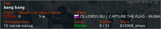 Играет на Counter Strike 1.6 сервере. Страна: РоссияПервый раз замечен 17:00 25.12.2025