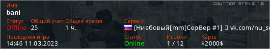 Играет на Counter Strike 1.6 сервере. Страна: РоссияПервый раз замечен 15:44 08.03.2023