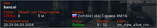 Играет на Counter Strike Source сервере. Страна: РоссияПервый раз замечен 20:27 06.03.2026