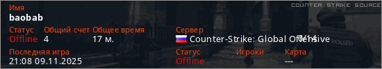 Играет на Counter Strike Source сервере. Страна: РоссияПервый раз замечен 11:06 09.11.2025