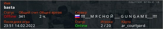 Играет на Counter Strike 1.6 сервере. Страна: РоссияПервый раз замечен 23:28 11.02.2022