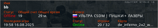Последний раз был в сети 19:58 16.08.2025 Игрок с таким ником замечен на 42 серверах