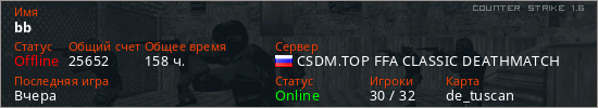 Играет на Counter Strike 1.6 сервере. Страна: РоссияПервый раз замечен 12:02 09.09.2021