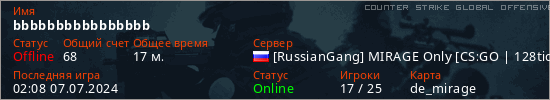 Играет на Counter Strike Global Offensive сервере. Страна: РоссияПервый раз замечен 16:41 25.06.2024