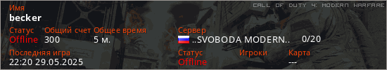 Играет на Call of Duty 4: Modern Warfare сервере. Страна: РоссияПервый раз замечен 22:12 29.05.2025