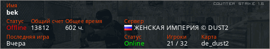 Играет на Counter Strike 1.6 сервере. Страна: РоссияПервый раз замечен 16:48 02.08.2021