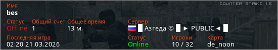 Играет на Counter Strike 1.6 сервере. Страна: РоссияПервый раз замечен 12:33 13.03.2026