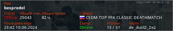 Играет на Counter Strike 1.6 сервере. Страна: РоссияПервый раз замечен 21:07 01.12.2019