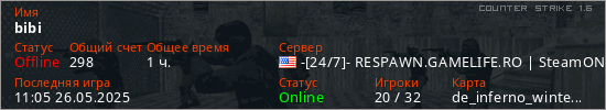 Последний раз был в сети 11:05 26.05.2025 Игрок с таким ником замечен на 28 серверах