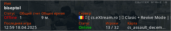 Играет на Counter Strike 1.6 сервере. Страна: РумынияПервый раз замечен 23:26 16.04.2025