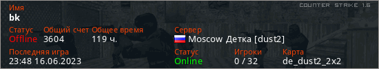 Играет на Counter Strike 1.6 сервере. Страна: РоссияПервый раз замечен 18:26 24.09.2021