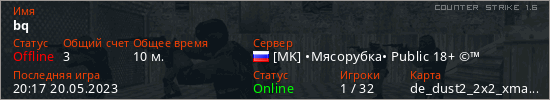 Играет на Counter Strike 1.6 сервере. Страна: РоссияПервый раз замечен 20:15 20.05.2023