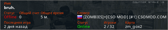 Играет на Counter Strike 1.6 сервере. Страна: РоссияПервый раз замечен 16:02 21.03.2026