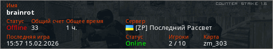 Играет на Counter Strike 1.6 сервере. Страна: УкраинаПервый раз замечен 19:05 13.02.2026