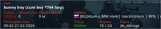Играет на Counter Strike Global Offensive сервере. Страна: РоссияПервый раз замечен 09:21 21.02.2026