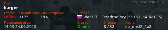 Играет на Counter Strike 1.6 сервере. Страна: РоссияПервый раз замечен 13:26 23.07.2021