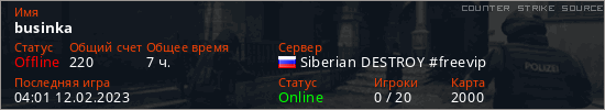 Играет на Counter Strike Source сервере. Страна: РоссияПервый раз замечен 02:32 28.01.2023