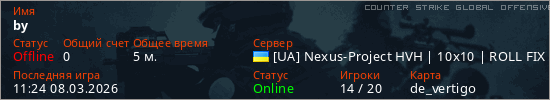 Играет на Counter Strike Global Offensive сервере. Страна: УкраинаПервый раз замечен 11:18 08.03.2026