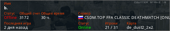 Играет на Counter Strike 1.6 сервере. Страна: РоссияПервый раз замечен 01:49 14.11.2019