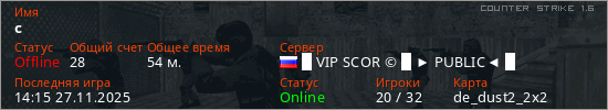 Играет на Counter Strike 1.6 сервере. Страна: РоссияПервый раз замечен 19:47 09.10.2025