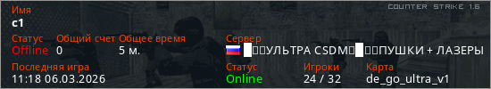 Играет на Counter Strike 1.6 сервере. Страна: РоссияПервый раз замечен 11:16 06.03.2026