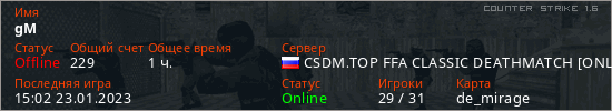 Играет на Counter Strike 1.6 сервере. Страна: РоссияПервый раз замечен 23:02 22.01.2023