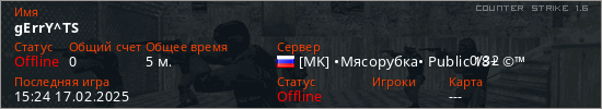 Играет на Counter Strike 1.6 сервере. Страна: РоссияПервый раз замечен 15:16 17.02.2025