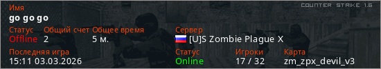 Играет на Counter Strike 1.6 сервере. Страна: РоссияПервый раз замечен 15:09 03.03.2026
